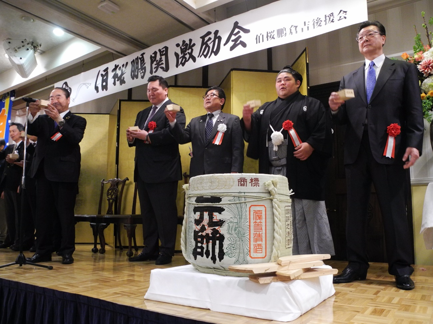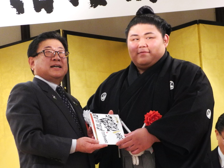 広田後援会長から激励金を受け取る伯桜鵬関
